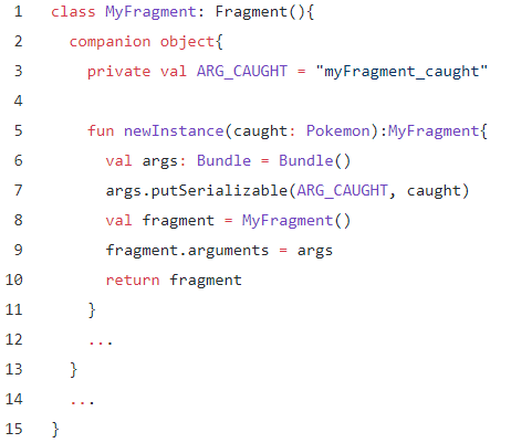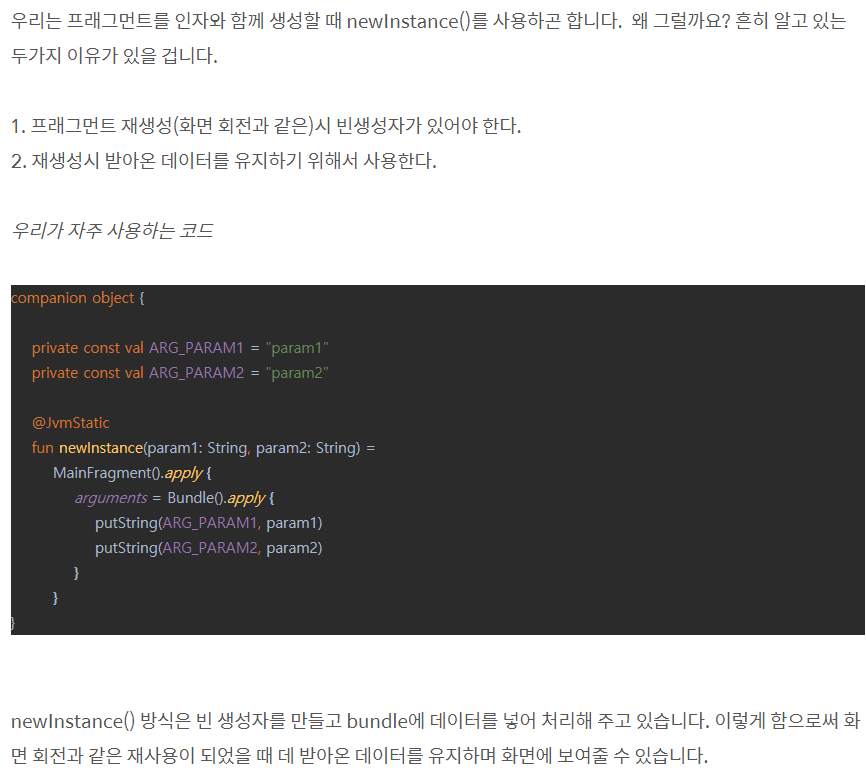 프래그먼트를 생성하면 자동으로 동반 객체 컴포넌트가 생성된다. 프래그먼트는 특수한 제약 때문에 팩토리 메서드를 정의해여 인스턴스를 생성해야 한다. (팩토리 메서드는 위에서 설명했다.) 프래그먼트를 다뤄 본 경험이 있다면 newInstance() 메서드를 보았을 것이다. 다음 예시를 보자.