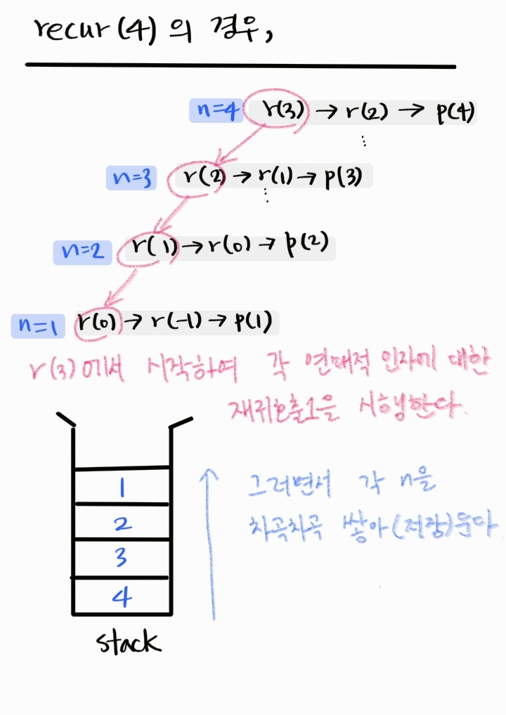 거창하게 그림까지 그렸지만 간단한 이야기다. 그냥 가장 먼저 연쇄적으로 일어나는 재귀호출1에 따라서, 각 호출의 인자에 해당하는 n을 기억해두어야 하므로 stack에 차곡차곡 쌓아두자는 말이다. 가장 나중에 들어가는 n에 대한 메서드를 가장 먼저 처리해야 하므로 stack의 구조가 알맞다. 후입선출의 자료구조이기 때문이다.