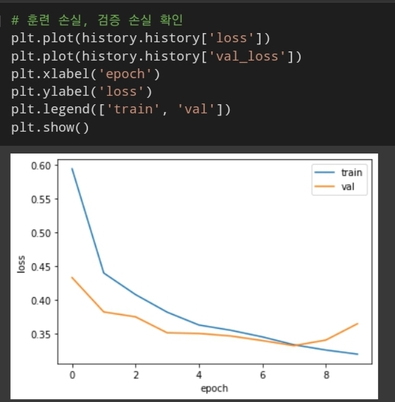 - 변경 전(RMSprop): epoch 6에서 검증 손실이 증가추세임