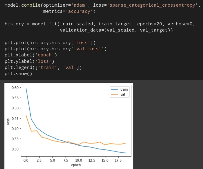 '훈련세트의 손실 곡선 vs 검증세트의 손실 곡선'을 시각화해보자.