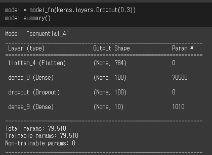 랜덤으로 30%를 드롭아웃하는 드롭아웃 객체(층)을 모델에 추가해보자.